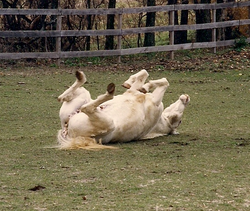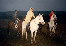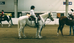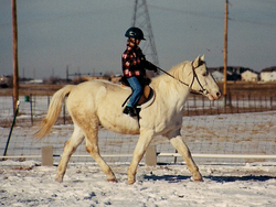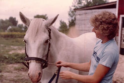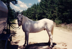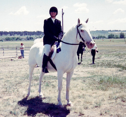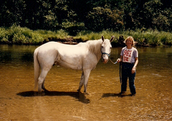 Haps taught countless kids to ride over the years. As he aged, he seemed to become a wise old soul, much different from the wild soul that challenged me for so many years. It was as if he just knew he had to take care of them. But I lost him too soon. With his light skin and white coat, he fell victim to cancer, and I had to put him down when he was just 22. I had him creamated and took him back to the Pryor Mountains Wild Horse Range, where I scattered his ashes so he could once again be 'home'. I know I'll see him again one day, if the Rainbow Bridge story is true (see a copy of it here).